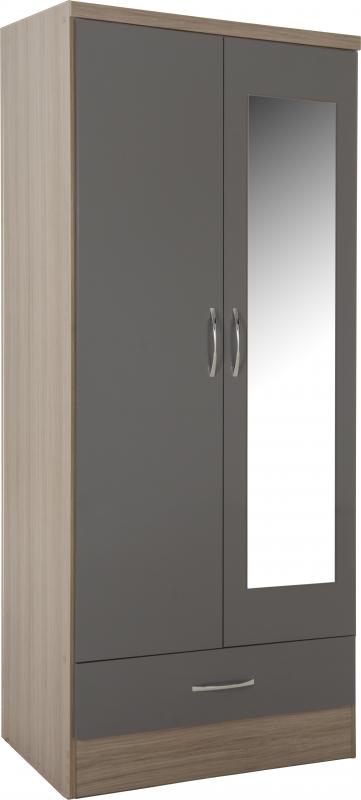 Nevada 2 Door 1 Drawer Wardrobe – Grey Gloss/Light Oak Effect Veneer – WBF
