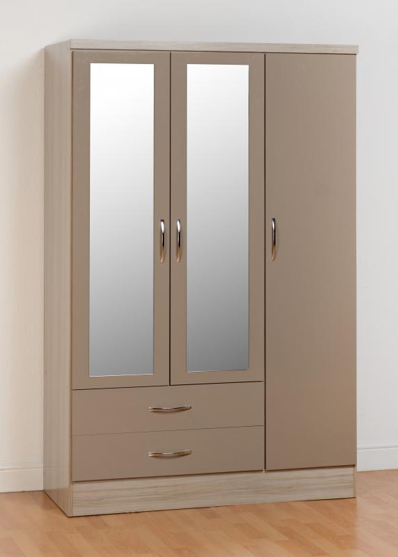 Nevada 3 Door 2 Drawer Mirrored Wardrobe – Oyster Gloss/Light Oak Effect Veneer – WBF