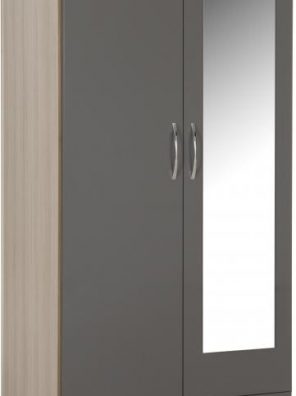 Nevada 2 Door 1 Drawer Mirrored Wardrobe – Grey Gloss/Light Oak Effect Veneer – WBF